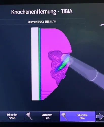 Einer der größten Fortschritte des neuen Systems ist der Verzicht auf eine vorherige CT-Untersuchung. Stattdessen werden zu Beginn der Operation Anatomie und Bandspannung des Kniegelenks durch einen speziellen Pointer erfasst. Dadurch wird in Echtzeit ein hochdetailliertes 3DModell erstellt. Während der OP sorgt eine Schutzbarriere durch eine haptische Begrenzung dafür, dass das hochpräzise Fräsinstrument automatisch stoppt, bevor gesunder Knochen oder wichtige Weichteile verletzt werden.