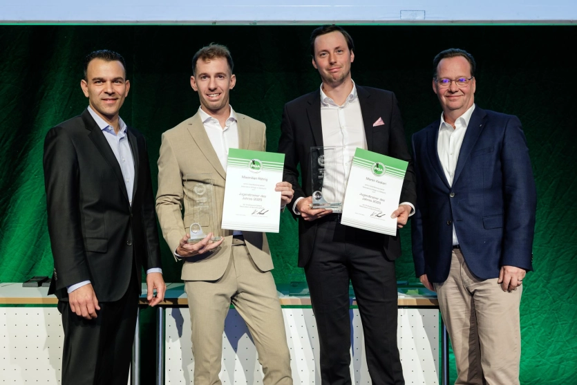 Die Aufgabe, Menschen auf einem Weg zu begleiten, leben auch Maximilian Röhrig und Martin Keskari, die Jugendtrainer 2025 der PGA of Germany, die im Golfclub Neuhof wirken. Dort sind sie „weit mehr als nur Golftrainer“, so Laudator Jochen Nachwey, der Präsident des Golfclubs Neuhof.