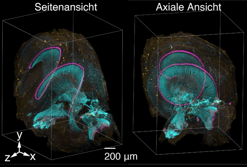 Lichtblattmikroskope machen Gewebe und ganze Organe in eindrucksvollen 3D-Bildern sichtbar, etwa die filigrane Hörschnecke im Innenohr oder das komplexe Gehirn einer Maus. Eine dünne Schicht aus Licht, das Lichtblatt, bewegt sich dabei durch die Probe und erzeugt Ebene für Ebene ein dreidimensionales Abbild. Bei größeren Proben stoßen herkömmliche Geräte jedoch an Grenzen: Sie sind langsam und liefern unscharfe Bilder.